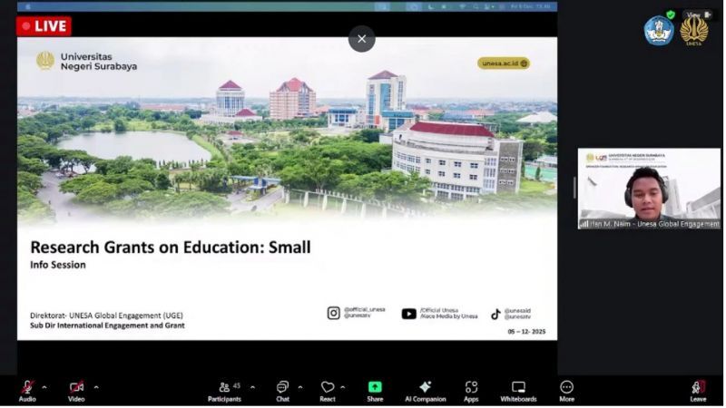 Unesa.ac.id. SURABAYA—Unesa Global Engagement (UGE) kembali memperkuat langkah internasionalisasi kampus melalui penyelenggaraan Info Sessions Spencer Foundation: Research Grants on Education pada Jumat, 5 Desember 2025. Kegiatan ...