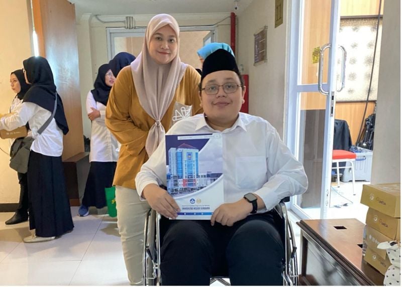 Unesa.ac.id. SURABAYA—Di tengah deretan dosen baru yang mengikuti prosesi pengambilan sumpah PNS di lingkungan Universitas Negeri Surabaya (Unesa), Rizky Basatha, dosen baru pada prodi Pendidikan Teknologi Informasi (PTI), Fakultas Teknik (FT) tampak menjalani sumpah pegawai dengan berkursi roda pada Senin, 2 Juni 2025.