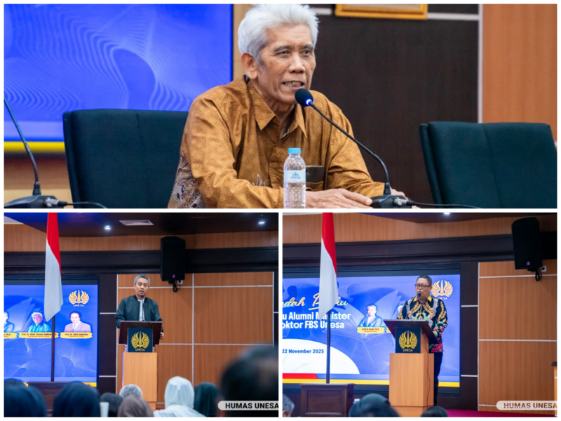 Unesa.ac.id. SURABAYA— Hadiah paling bermakna dari murid kepada gurunya adalah memastikan gagasan sang guru terus hidup dan berkembang. Semangat itulah yang melatarbelakangi Fakultas Bahasa dan Seni (FBS) Universitas Negeri Surabaya menggelar Temu Alumni Magister dan Doktor Pascasarjana FBS sekaligus Bedah Buku “Seni, Sastra, dan Budaya Lokal: Pendekatan Multi-, Inter-, dan Trandisipliner”, pada Sabtu, 22 November 2025, di Auditorium Lantai 11 Gedung Rektorat Kampus II Lidah Wetan.