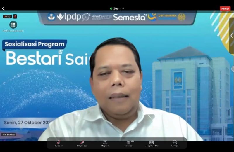Unesa.ac.id, SURABAYA—Universitas Negeri Surabaya (Unesa) menggelar Sosialisasi Program Bestari Saintek secara daring pada Senin, 27 Oktober 2025. Kegiatan ini bertujuan memperkuat pelaksanaan tridharma perguruan tinggi melalui riset dan inovasi yang berdampak langsung bagi masyarakat.